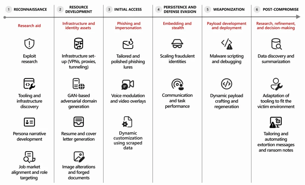 Threat actors have incorporated automation into their tradecraft as reliable, cost‑effective AI‑powered services lower technical barriers and embed capabilities directly into threat actor workflows. These capabilities reduce friction across reconnaissance, social engineering, malware development, and post‑compromise activity, enabling threat actors to move faster and refine operations. For example, Jasper Sleet leverages AI across the attack lifecycle to get hired, stay hired, and misuse access at scale. The following examples reflect broader trends in how threat actors are operationalizing AI, but they don’t encompass every observed technique or all threat actors leveraging AI today.