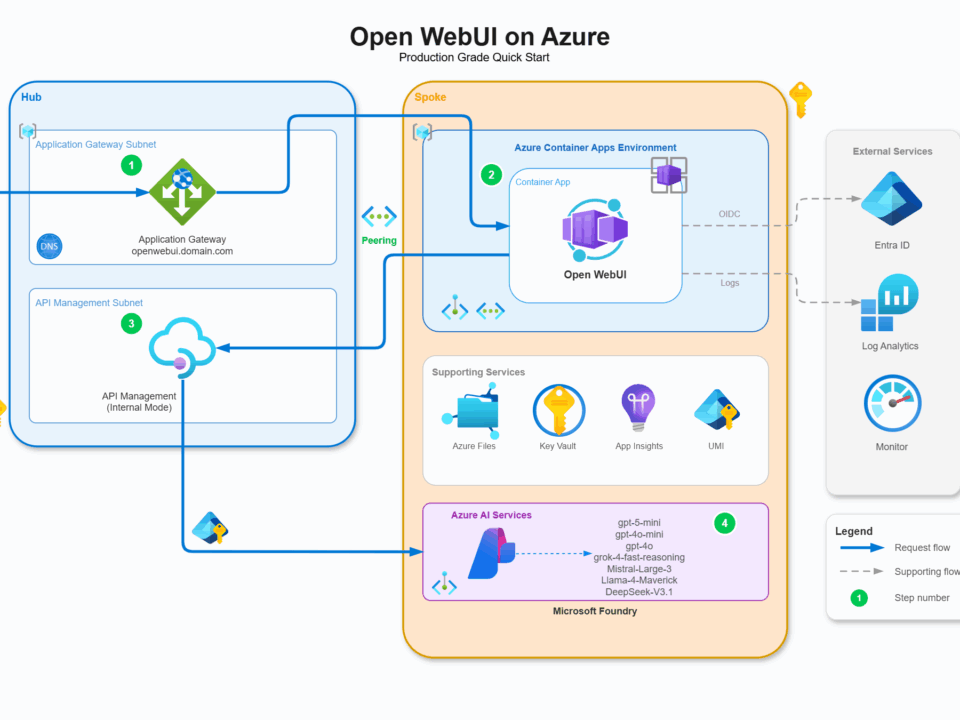 January 12, 2026Published by Dan Rios on January 12, 2026Categories CommunityOpen WebUI on Azure: Part 1 – Architecture & DeploymentIntroduction Full solution is available free over on my GitHub: https://github.com/riosengineer/open-webui-on-azure Open WebUI is an open source, self hosted, feature rich AI platform with a built […]